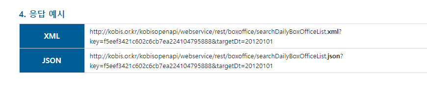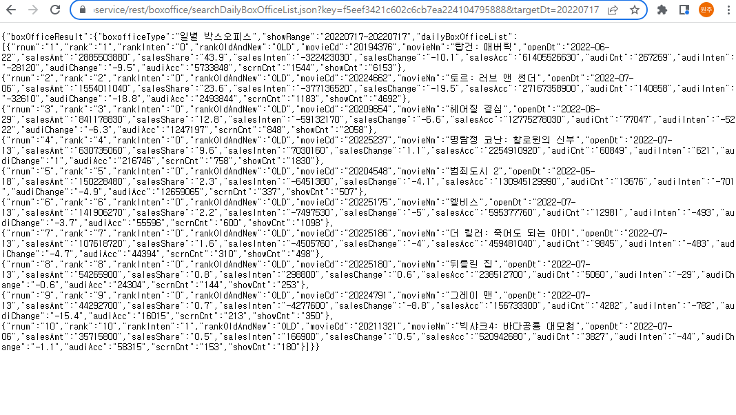 "https://kobis.or.kr/kobisopenapi/webservice/rest/boxoffice/searchDailyBoxOfficeList.json?key=f5eef3421c602c6cb7ea224104795888&targetDt=20220717",