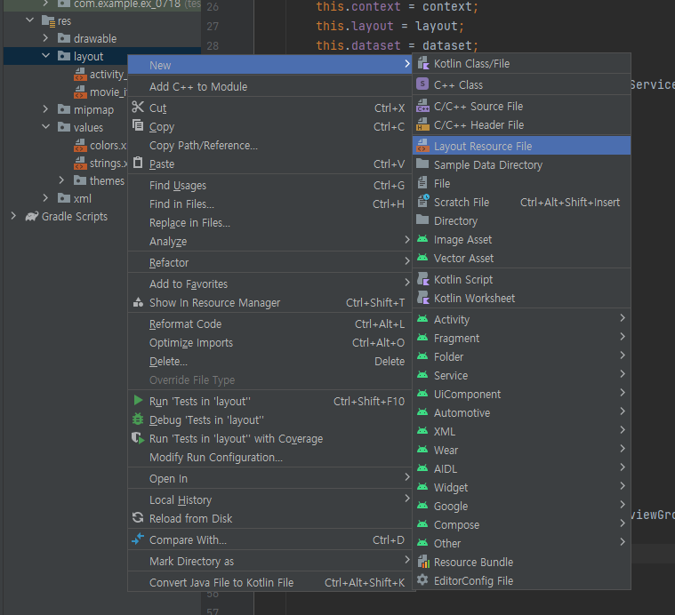 이제 안드로이드 스튜디오로 접속 후 res -> layout에 새로운 레이아웃 파일을 만들어주자
