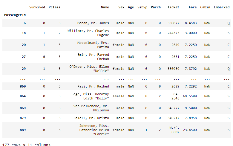 # train - Age 컬럼 결측치 행 모두 확인하기