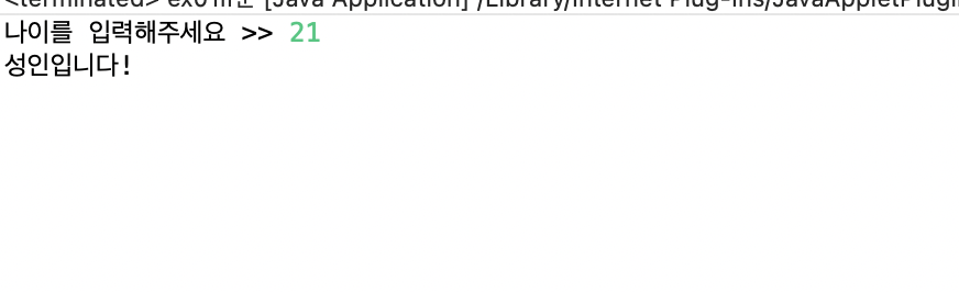 - 정수(나이)를 입력받아 20세 이상이라면 "성인입니다"를 출력해보자