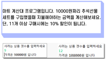- 상품의 갯수가 10개 이하라면, 상품의 갯수 * 10000/ 상품의 갯수가 11개 이상이라면, 상품의갯수*10000 에 10프로 할인된 90프로의 가격만 지불하면 되기 때문에, 0.9를 곱해준다.