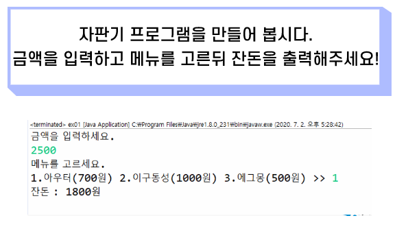 System.out.print("1. 아우터(700원) 2. 이구동성(1000원) 3. 에그몽(500원) >> ");