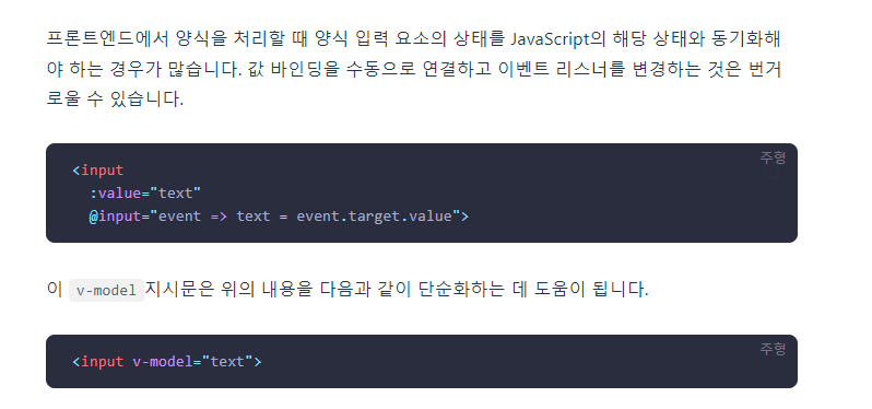 공식문서를 확인해보면 v-bind 와 v-on을 합쳐 v-model 을 사용할 수 있다
