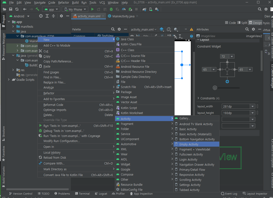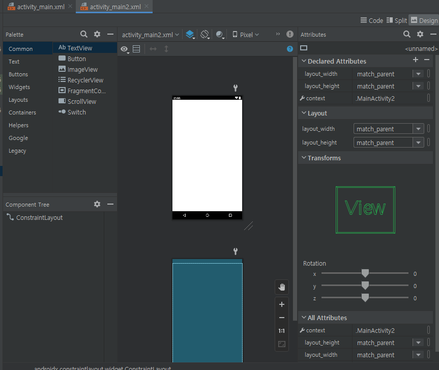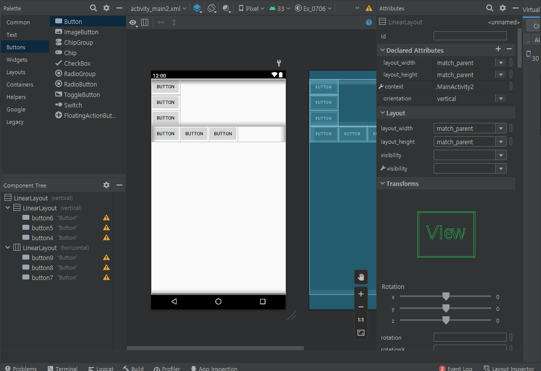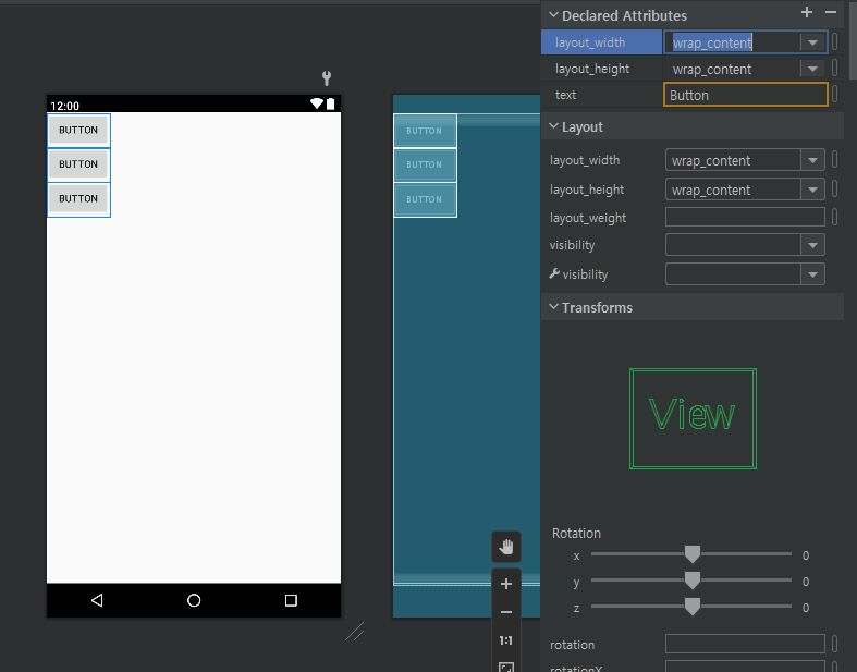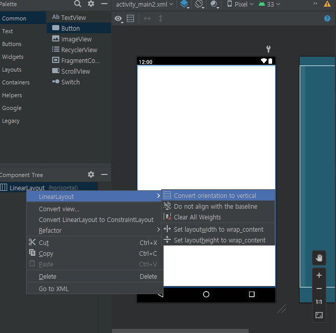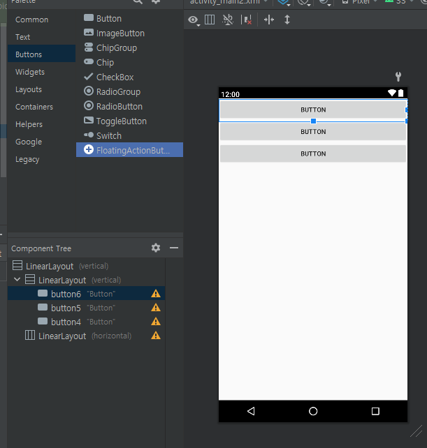 이때 버튼이 또 사라져 있다면 레이아웃들의 height를 wrap_content로 변경 해 주자