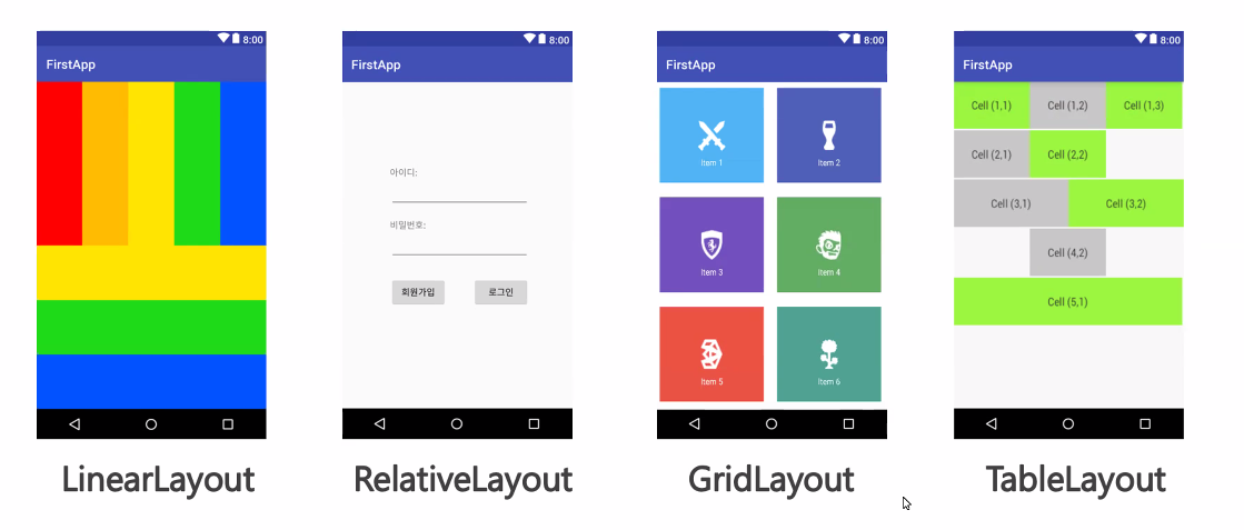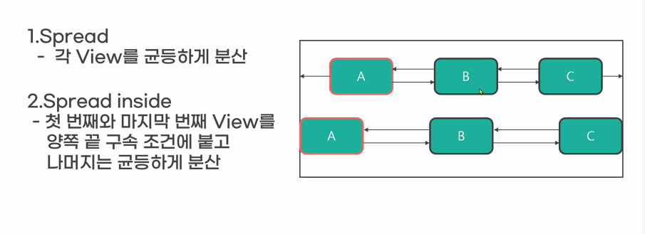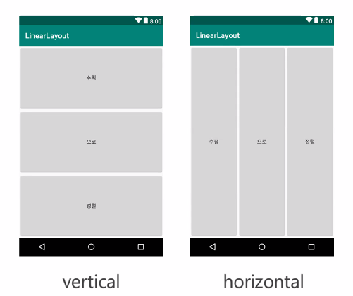 - 한쪽 방향으로 쌓는 방식으로 View들을 수직 또는 수평으로 구성