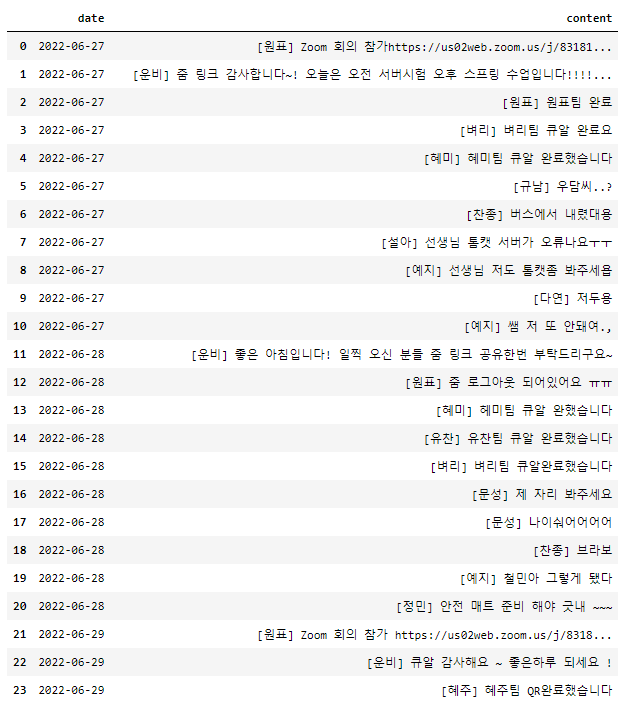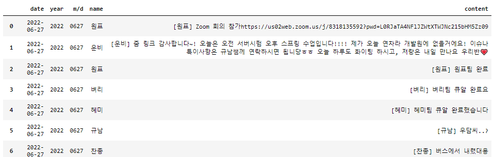 ['2022-06-27','[운비] 줌 링크 감사합니다~! 오늘은 오전 서버시험 오후 스프링 수업입니다!!!! 제가 오늘 연차라 개발원에 없을거에요! 이슈나 특이사항은 규남쌤께 연락하시면 됩니당ㅎㅎ 오늘 하루도 화이팅 하시고, 저랑은 내일 만나요 우리반💗'],